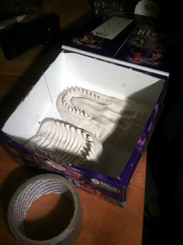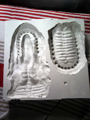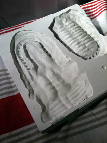 Asegúrese de que capturar todo el detalle sin dañar los dientes frágiles, coloqué la plastilina en una caja y vertido yeso muy mocosa todo alrededor de él.
