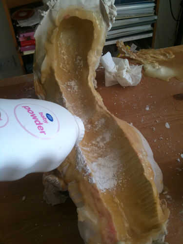 En primer lugar, polvo de látex con talco. Esto evita que se pegue a sí mismo como usted lo saca. No puedo insistir en cuánto provocación esto le ahorrará. Hacer no omitir este paso.