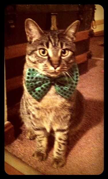Lo que ayuda realmente, es poner una pajarita verde en su gato. Esta es la más importante parte, así que todo el tiempo que necesites.