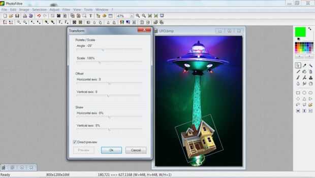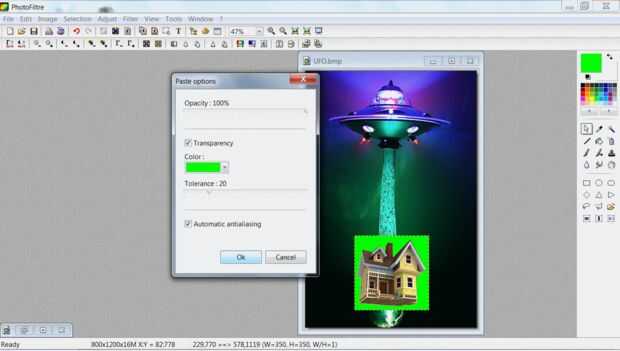 A continuación, haga clic derecho en su casa, seleccione copiar. Haga clic derecho sobre la imagen de UFO y seleccione pegar. Haga clic derecho sobre la imagen pegada y seleccione Opciones de pegado. Marque la casilla de transparencia y establecer la tolerancia a 20. Haga clic en la imagen otra vez y seleccione transformar, libre. Las opciones disponibles, ajustar el tamaño de la imagen, posición y ángulo. Puedes ver las opciones que elegí en la captura de pantalla incluida. Una vez tuya es tamaño y colocada correctamente, haga clic en Aceptar.
