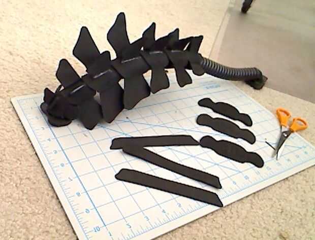 La columna vertebral del edificio era bastante sencillo. Un trozo de conducto de aluminio flexible hace una columna natural agradable. Relleno con espuma de solucionador de problemas y la sostuvo en la forma curva que quería hasta la espuma ampliada y endurecido. Cuando mis brazos se cansaron la coloqué entre dos opuestos macetas pesadas, para seguir manteniendo las curvas para mí. Era seco que aerosol pintado, y luego aplica las vértebras. Cada vértebra está hecho de 2 piezas que se enclavijan de espuma de la hoja. Hice el patrón en papel (una vez más, sólo prueba y error) y luego hizo unos tamaños basados en el maestro. Solía fino elástico negro para tirantes fácil de hacer, pero podría utilizar cualquier material que se adapte a tu disfraz si te gustan más prominente.