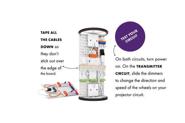 Defender la Rotolamp con una rueda como la base y a su circuito de prueba. Asegúrese de que el receptor inalámbrico está en el mismo canal (a, b, c, d o e) como su transmisor. Utiliza el circuito transmisor para hacer girar el proyector!
