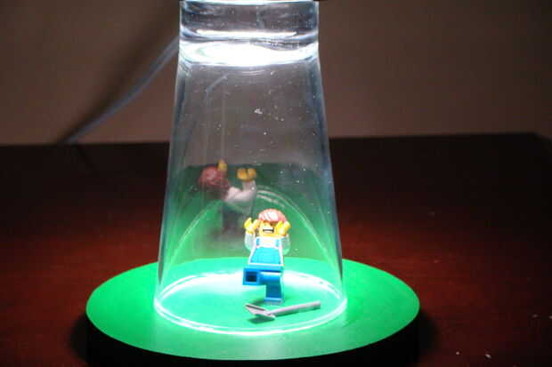 Aquí está mi opinión sobre la lámpara de abducciones.Paso 1: materiales:Platos de papelCinta de papel o cinta de plata3/4 de pulgada mini cinta o cinta de washivaso de plástico 24 oz.cartulina verde o papelHuevo de Pascua shell o botella de tapónvela