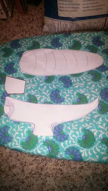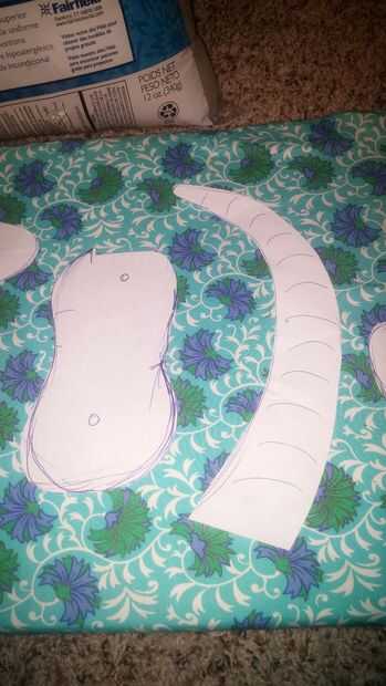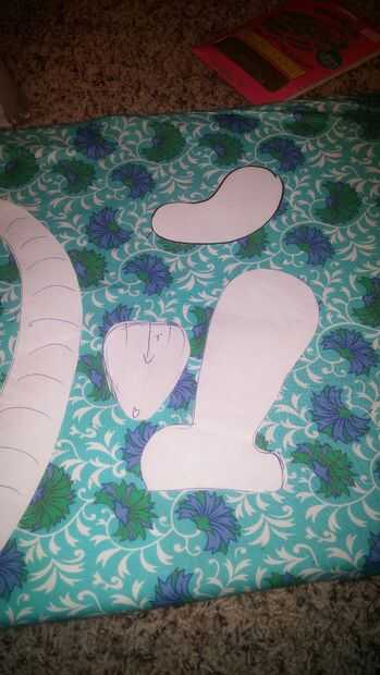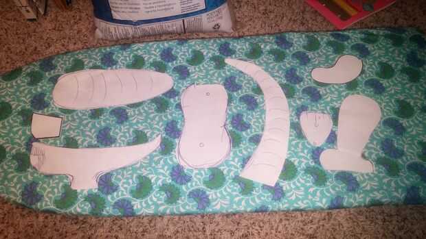 Dibujaba un patrón rápido y cortan de una tela de polkadot ridículo para ver rápidamente si tenía que cambiar las cosas. Lo hice, necesitaba la cabeza sea más grande y los brazos para ser más grande y las piernas para cambiar ligeramente de forma. Yo sólo con cinta papel extra en la vola listo para la cosa real y la pieza original. Yo quería hacer la cola parecen fue seccional y el jefe para tener algunos detalles extras y quería que los dientes de los dientes.