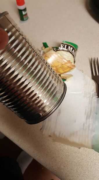Ahora ponemos pegamento en la parte superior de la tapa y coloque la parte inferior de la lata en la que, tendrá que tenerlo pulsado unos instantes, pero después de eso puede dejar solo hasta la seca del pegamento.