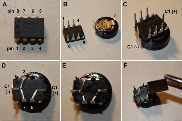 D. doblar los pines del condensador de almacenamiento hacia el MAX756 para el chip en lugar del clip. Doblar los pines 2 y 7 en el MAX756 así que casi toquen pin negativo del condensador de almacenamiento C1(-). Doble pin 6 por lo que está tocando casi pin positivo del condensador de almacenamiento C1(+).