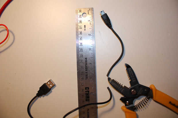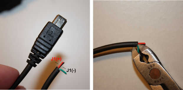 El aislante exterior de la tira en el extremo mini-B de 1/4 de pulgada. Una vez que usted sabe que los cables son positivo y tierra, J1(+) y J1(-), tira de los cables en el extremo mini-B y cortar los dos cables restantes.
