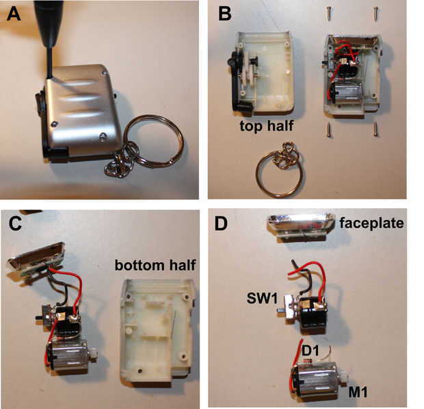 D. recorta los dos cables cerca de la placa frontal. Se utiliza el cable que soldamos al interruptor, así mantener ese hilo tan largo como sea posible. Luego enganche el cable y el extremo del diodo D1 (la negativa, el extremo del cátodo está marcada con una línea negra) cerca de las pilas de monedas apiladas para que las longitudes de alambre y el diodo que se extiende desde el motor M1 son tan largas como sea posible.