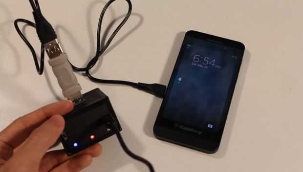 En la foto de arriba, tengo mi cubo de poder cargar un Blackberry mientras se está cargando el cubo de poder sí mismo. El LED azul indica que la batería está bajo carga, y el LED rojo indica que la carga de batería está en progreso.