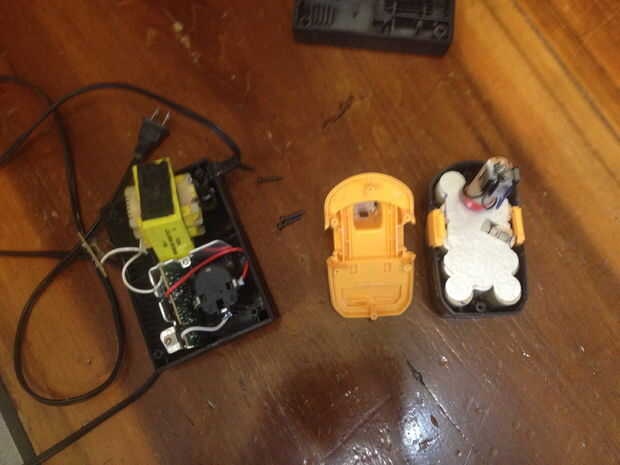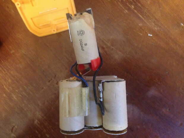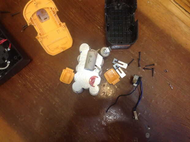 Los principales componentes de la batería son los siguientes. La carcasa exterior, esto queremos para aferrarse a nuestros componentes y para interactuar con las herramientas. Los clips, éstos salen fácilmente una vez que se toma el caso aparte. Constan de un resorte y la pinza de plástico, una a cada lado. El clip de contacto, esto es muy importante para interactuar con la herramienta. El paquete de baterías de Nicd, esto ya no es necesario para este proyecto. Si tuyo todavía funciona, es posible que pueda reutilizar, pero mía no mantiene una carga.