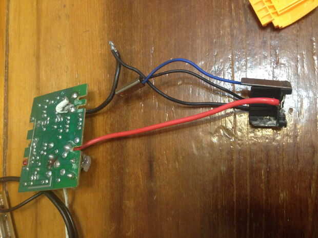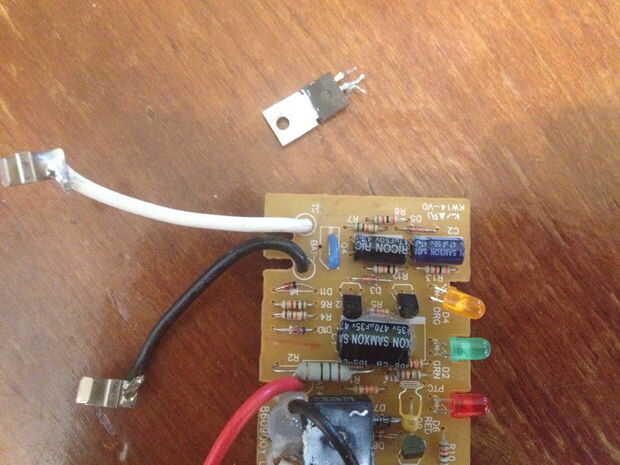 La foto de arriba muestra cómo poder se enruta a través de la Junta. Al final del bucle negativo, hay un transistor de potencia que sirve como un interruptor para apagar la alimentación. No queremos por lo que debe ser desactivado. Saqué el transistor y poner un puente a través de él. Este es un paso innecesario porque no hay una manera más fácil en el transistor. Incluyo lo que hice aquí porque podría ayudar con encontrar un cargador de otro modelo o marca. Después de deshabilitar el transistor con un puente, podría correr la herramienta el circuito cargador.