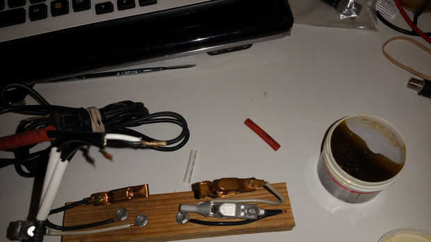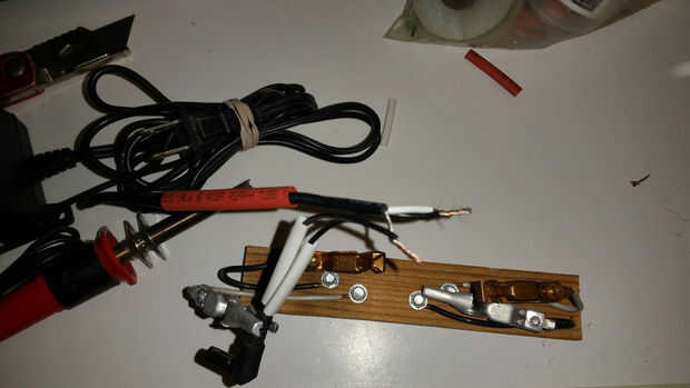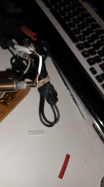 Antes de sujeción me resbalé del encogimiento del calor sobre los cables. Todo afianzado con abrazadera y torcidos los pares juntos. Aplica una pequeña cantidad de resina a cada extremo del cable. Luego procedí a soldar los extremos de mi dos en un giro del lazo de pan, porque creo que es el más fuerte, pero a veces es difícil de encajar en calor encogen. Me cabe aunque de hecho.