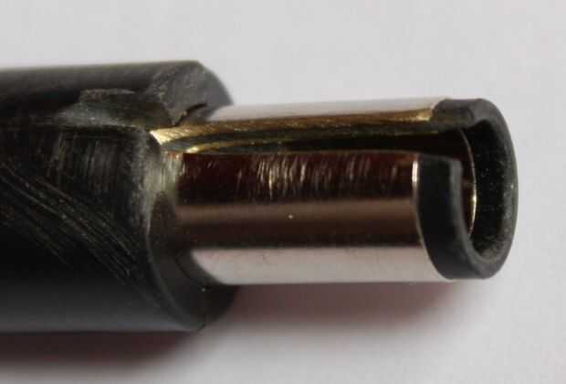 Para cortar la ranura utilicé una herramienta Dremel. La raja que cortar completamente la tubería. Necesario poner fin a unos milímetros dentro de la base de la toma. Tenga cuidado de no cortar el pasador de guía.