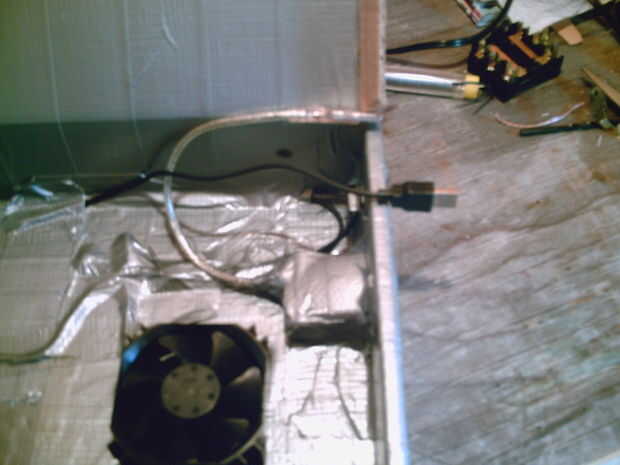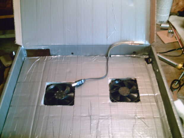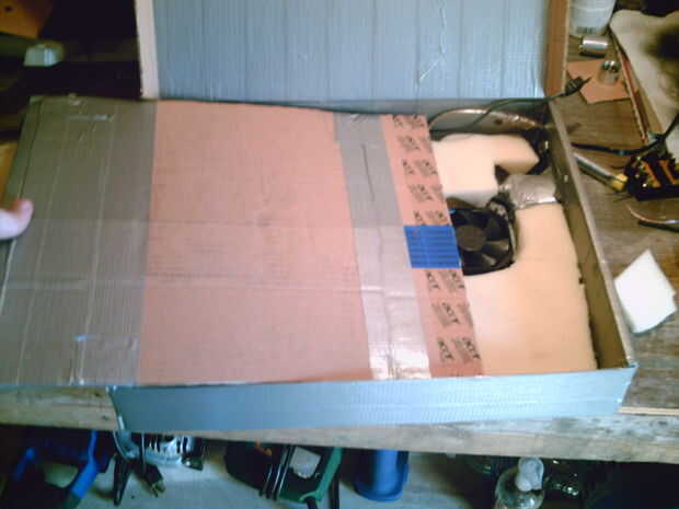 14. encontrar un pedazo de cartón lo suficientemente grande como para cubrir el fondo entero de su caja. corte agujeros para sus fans y una muesca para sus cables y reforzar con una capa de cinta adhesiva