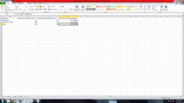 Aprendí a programar una calculadora RPM ("velocidades") en Excel 2010 por lo que yo puedo obtener mi propia tabla de velocidades. Es útil porque puedo añadir cualquier material que me gusta en cualquier momento como puedo proporcionar ese material SFM *.