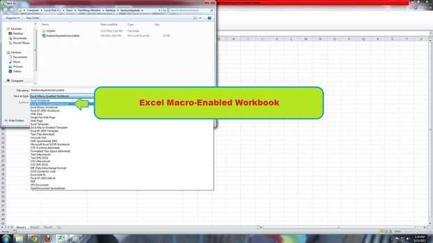 Elija: Libro de Excel habilitado para macros en las extensiones de archivo desplegable
