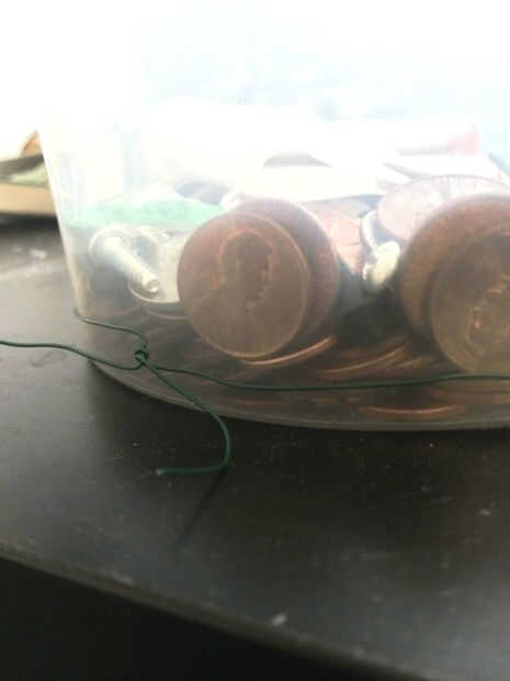 Utilizando la tapa de la bobina de CD he trabajado desde la parte superior, primero creó un lazo alrededor de la tapa, corte el cable y atado apagado. Hizo lo mismo en la parte inferior y luego utiliza cinta adhesiva para ayudar a mantener por el momento. Empate en un cable que es la altura del objeto cilíndrico esto dará poco pedacito más robustez y también un punto de partida. He puesto cinta adhesiva sólo en dos puntos porque me gustan las imperfecciones que crea.