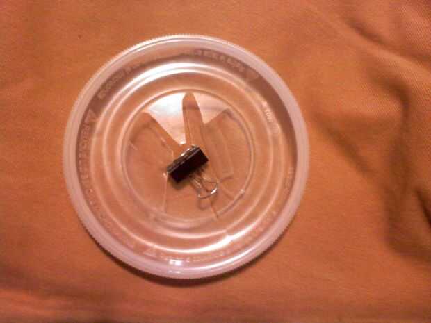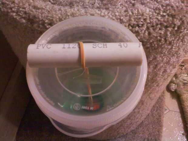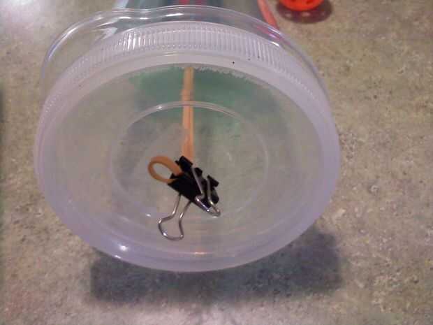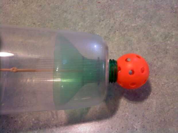 Eso es todo, ahora sólo Enrosque la botella en el interior del envase, correr la goma con la bola dentro de la botella y tire de ella hasta el agujero en la tapa del corte con el clip de papel. Actualizar... la parte superior resultada para ser para adelgazar, por lo que el clip ha sido reemplazado por un tubo de PVC.