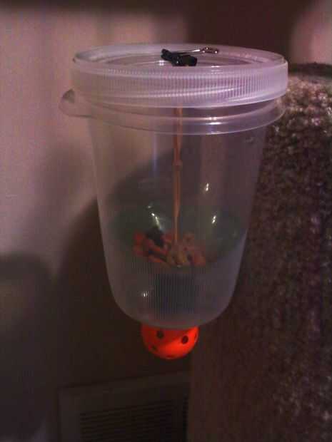 El entrenamiento era bastante fácil. Mostrar su gato que alimento caerá cada vez que la bola se empuja o se tira hacia abajo. Con Apolo, tuvo una vez. Encontré uno de los problemas es que tire del clip de la parte superior, dejando caer la bola, pero sólo cuando agote el alimento.
