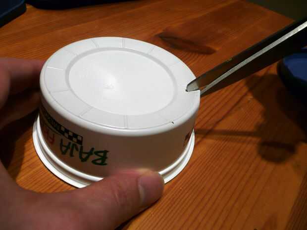 Aquí es donde entran las tijeras; cortar la parte inferior de la tina en la esquina, para crear una abertura. Haga un segundo corte sobre longitud de dos pastillas de la primera de ellas.