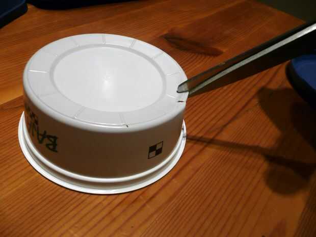 A continuación, insertar los puntos de las tijeras y ampliar cada raja hasta cuatro veces como bolitas de comida de su gato. Aproximadamente la mitad de cada ranura debe estar por encima de la parte inferior (en el lado de la bañera) y cerca de la mitad por debajo de ella (en la parte inferior de la tina). Tratar de hacer cada corte directamente a través de la esquina (perpendicular a la parte inferior de la tina), pero si fuera por diez o quince grados, no lo sude.