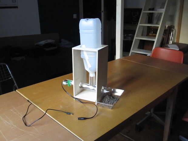 Se trata de un alimentador de gato automático basado en el taladro. Varias libras de comida para gatos se almacenan en el depósito por encima de la barrena, y el alimentador está programado para dispensar automáticamente 1/4 de taza de alimento en l