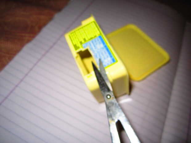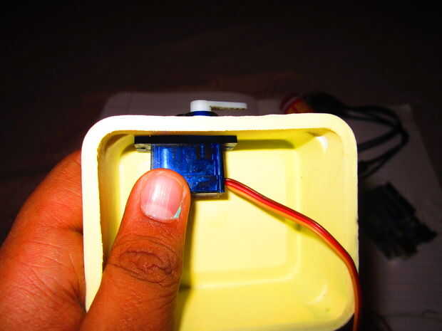 II) corte un agujero en la caja que el servomotor puede caber a través de él. Introduzca el motor interior y cinta en lugar tal que el cuerno es un lateral de la caja (ver foto).