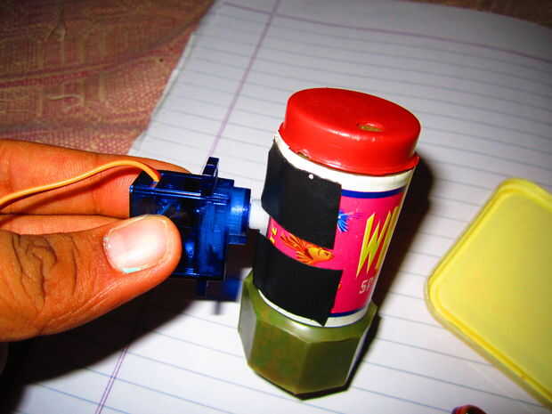 i) con cinta adhesiva un cuerno del servo para el caso de alimentos que cuando la caja se abre el cuerno del servo es cuarto de un círculo de ella. Unir el motor servo a la corneta.