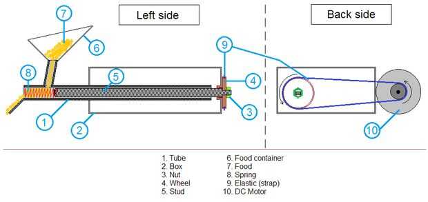 Se trata de un alimentador de gato automático basado en el taladro.  Varias libras de comida para gatos se almacenan en el depósito por encima de la barrena, y el alimentador está programado para dispensar automáticamente 1/4 de taza de alimento en l