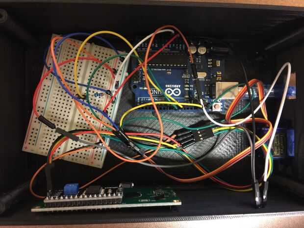 Para hacer el alimentador de los pescados más estable, utilizar el pegamento y pegar la parte inferior de las placas Arduino y breadboards a la vivienda.