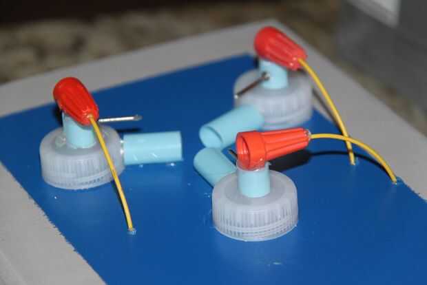 2. Taladre 3 agujeros el tamaño exacto del diámetro del LED en la parte de cada uno de los tapones de 3 botellas.