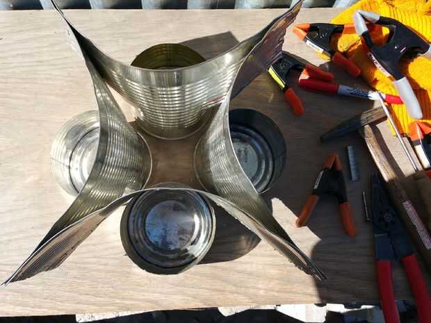 Una vez que tienes las alas sujetadas, puede tomar el tercer puede y sujete su brazo a la segunda. Luego fije el ala de la poder de cuarta a la tercera puede. Finalmente fije el ala de la poder del cuarto a la primera puede unir todo junto. La última foto de esta sección muestra las alas sujetadas. Si tu trabajo de fijación no se ve tan limpio como te gustaría que como que, no se preocupe, se cubrirá por el sellador de silicona al final del proyecto. Usted también notará en la foto que los fondos de las latas no se sienten totalmente en la mesa. Esto es debido a las tapas de las latas que arquear hacia fuera debido a no se sujetan. Se fije las tapas en el paso siguiente.