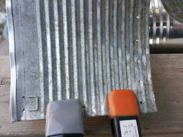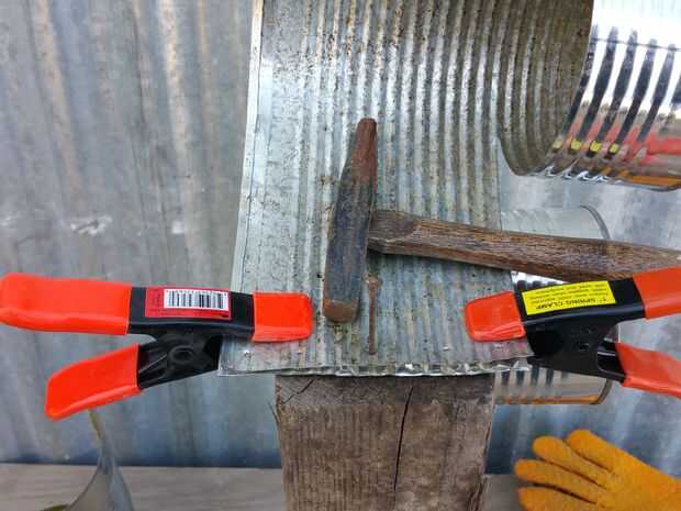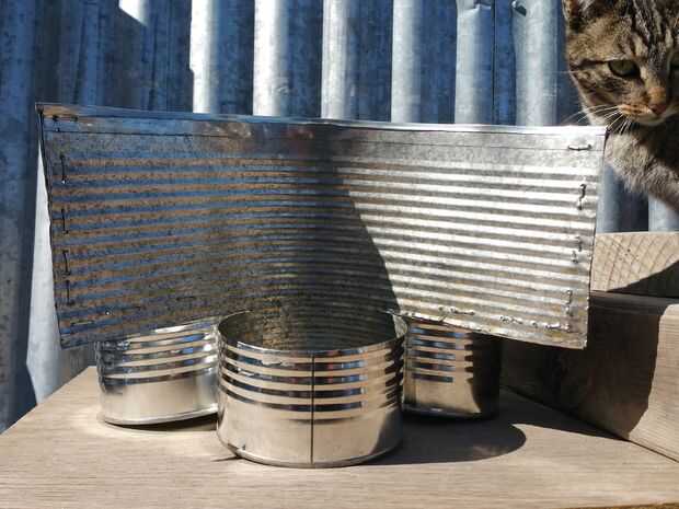 Las latas se llevan a cabo junto con las grapas. Mi pistola de grapas no era lo suficientemente poderoso, ni era las grapas para perforar las latas. En su lugar usé pequeños clavos y un martillo para perforar agujeros a través de las dos capas de estaño. Luego inserta las grapas y se inclinó sobre los extremos con unos alicates.