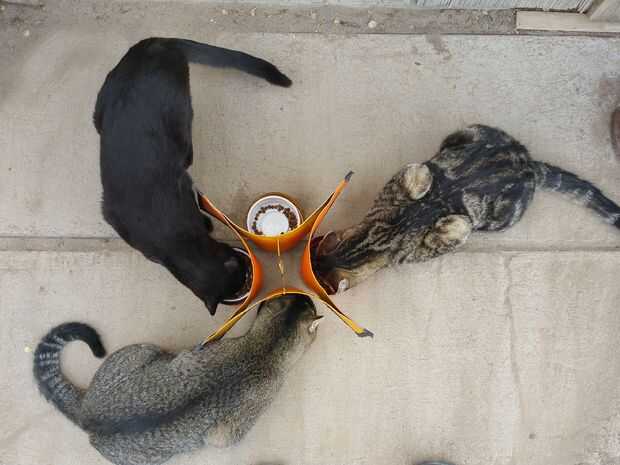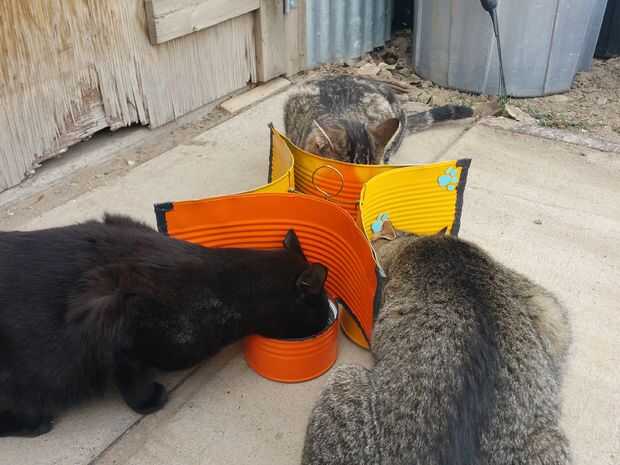 Fue la pregunta en mi mente cuando terminé el proyecto. Había sólo una manera de averiguar. I montar las latas pequeñas en el alimentador y lleno con comida para gatos. Llamé a los gatos hambrientos hacia fuera para la comida de medio día... y le gustó!!! .. .en menos de tres de ellos lo hizo, es decir. Uno definitivamente no estaba interesado en absoluto. Ella puede no les gustaron el olor de la pintura o la combinación de colores de dos tonos... no estoy seguro lo que fue tan desagradable. Con el tiempo estoy seguro que se ganará y publicaremos una foto final de todos disfrutando de su alimentador de lata de gato hambriento.