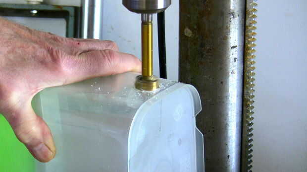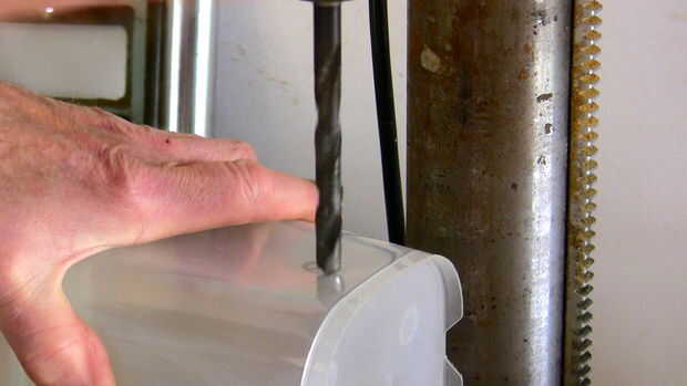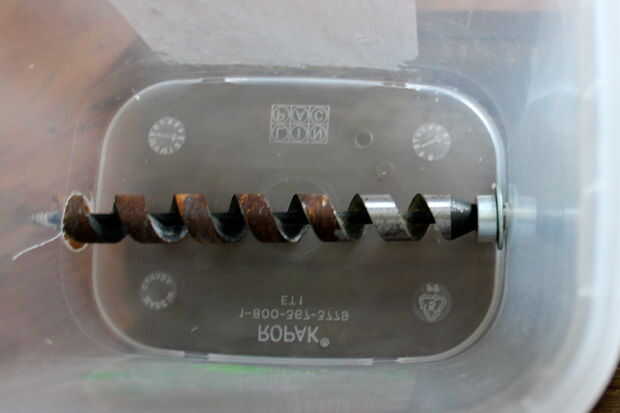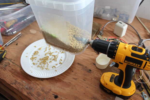Tenía un viejo 7/8 de pulgada de diámetro tipo madera perforación mordió en la mano y pensé que funcionaría muy bien para el tamaño de los pellets de alimento que normalmente alimento la trucha. Necesitaba un plástico contenedor que el taladro del pedacito palillo hacia fuera de ambos lados del envase. Los agujeros del dos taladro deben hacerse tan cerca de la parte inferior del contenedor como sea posible para que la mayor parte de la alimentación será empujada hacia fuera por la barrena, la fuente se acerca al final. Perforé el gran agujero con una broca Forstner pero la broca de barrena probablemente trabajaría así como alimentas muy lentamente a través del plástico suave. Antes de continuar con la Asamblea que decidí comprobar la operación de taladro utilizando el taladro portátil.