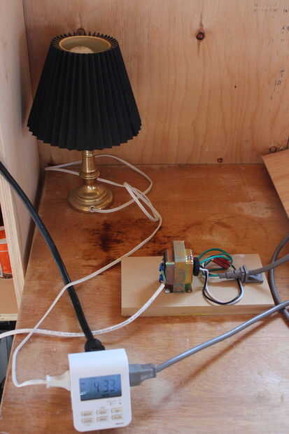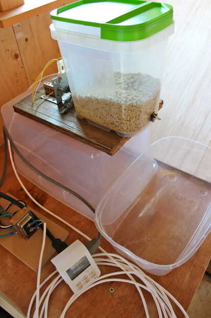 me mudé el alimentador a la nave junto a mi estanque de peces para hacer la final cableado y pruebas. Descubrí que necesitaba una carga (resistiva) adicional en el contador de tiempo electrónico darme de acción sincronización fiable y consistente. Le enchufamos una lámpara con una bombilla incandescente en la segunda toma del temporizador (si tiene solo una salida se puede utilizar una barra de poder para hacer lo mismo). Me gusta el temporizador electrónico porque precisamente puede establecer los tiempos de encendido y apagado, también, la batería de reserva mantiene los programas en su lugar debe haber un apagón. Todavía estoy experimentando para encontrar un más adecuado en el tiempo, pero ahora mismo parece como 5 o 6 minutos lo hará. El temporizador está programado para repetir todos los días de la semana.