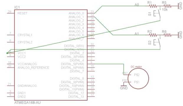 Poner el Adafruit Motorshield sobre Arduino. Conecte el motor al escudo del motor. Yo uso m3 (digital pin 5). Conectar pulsadores para Arduino canal análogo 0 y 1 (en Arduino pin del Código 14 y 15). Agregar un resistor de 10K entre cada botón y la tierra como un pull-down resistor (http://www.ladyada.net/learn/arduino/lesson5.html) y un bajo uno (100-220 ohm) entre el botón y el canal analógico por lo que la resistencia no es infinitamente pequeña. El botón que se acciona cuando la bandeja se extiende (es decir, puerta cerrada) debe ser en el canal 1 y el botón accionado cuando la bandeja se retrae (puerta abierta) debe ser en el canal 0.