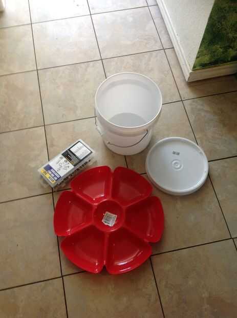 1) de la viruta y saborear el plato del árbol del dólar $1. 2) 2.5 galones cubo de ferretería $3 (puede obtener este cubo de tamaño gratis desde la tienda de comestibles en el Departamento de panadería. Se utilizan para el transporte de hielo. Sólo tienes que ser diligente y persistente como desaparecen rápidamente). 3) tapa de cubo de 2.5 galones $.99 (si usted no encontrar una cubeta libre). 4) varias tuercas y tornillos, taladro, brocas pequeñas y grandes. Esperemos que estos tiene o puede pedir prestado de alguien que la tenga :)