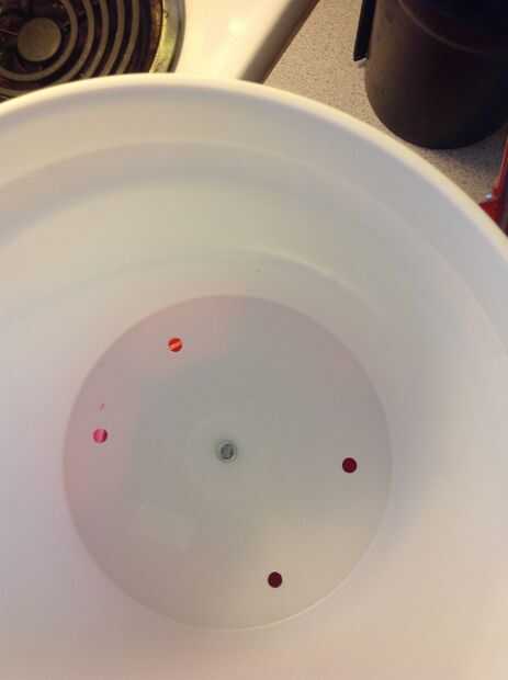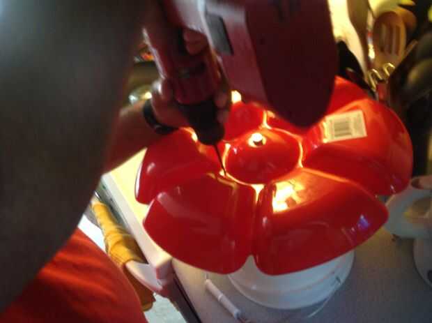 Después de instalar el perno de centro, entonces se pueden taladrar 4 orificios más pequeños para colocar en las nervaduras del plato viruta plástica. Se trata de refuerzo adicional sólo en caso de que usted decide colgar el alimentador completo o basta con tote mucho. No necesita terminar de conectar el cubo a plato todavía.