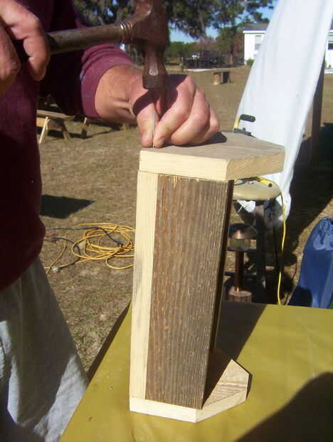 Con 4 tornillos/clavos, empezar en un extremo y la base de Tornillo/clavo en la pared lateral, trabajando su camino hasta el extremo opuesto. Asegúrese de mantener los bordes incluso. Repita estos pasos en el otro lado hasta que la base se asegura a dos piezas de la pared lateral.