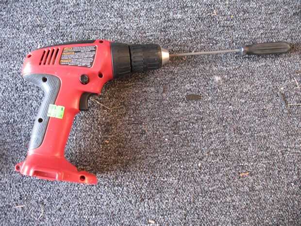 Seleccionar un destornillador que alguien destrozado y chuck para arriba en el taladro - las dimensiones no son críticas, pero si es demasiado largo podría sobresalir y ser inconveniente una vez que el taladro está en la parte superior del cajón de leche.