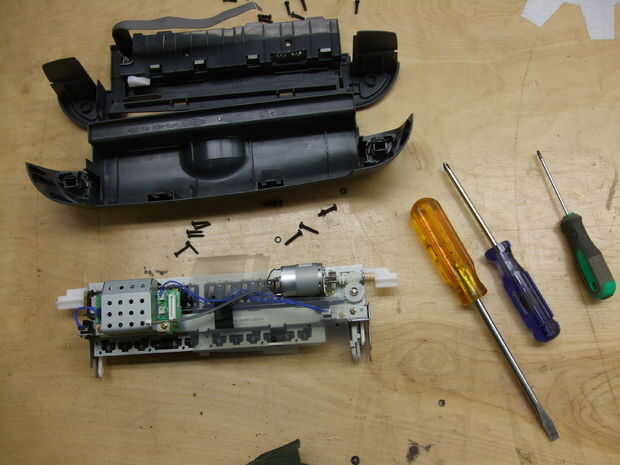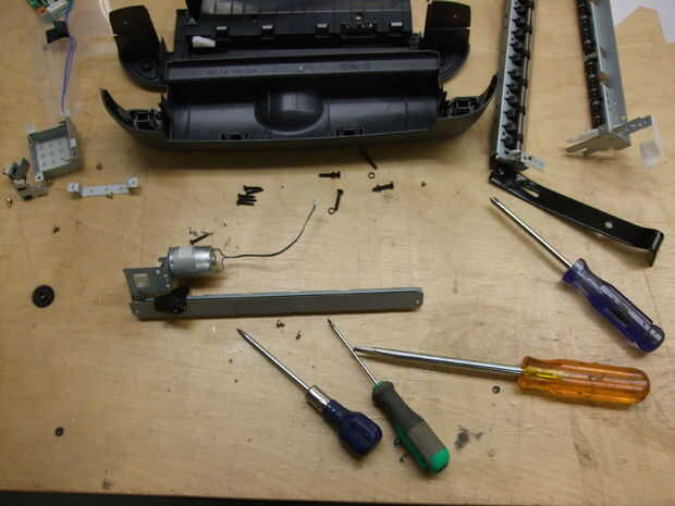 necesitaré algo para alimentar la varilla a la piscina de metal fundido.  Hmm, algo de la máquina, impresora fax roto.  Tenía algún tipo de mecanismo de corte de papel, pero creo que va a ser mucho más feliz mi varilla tig de alimentación.