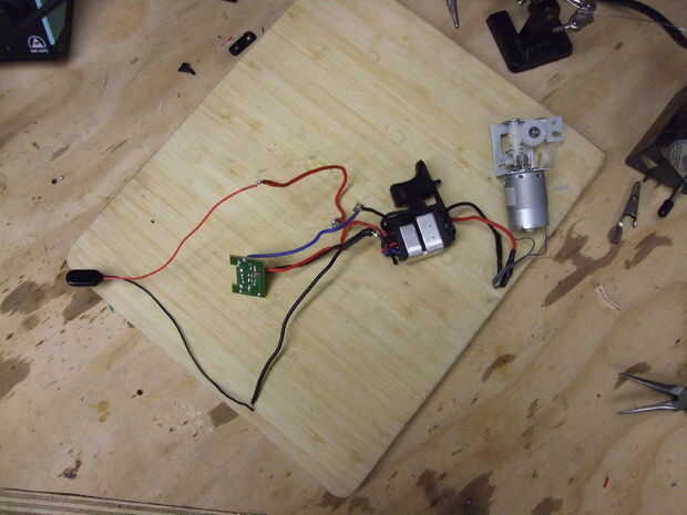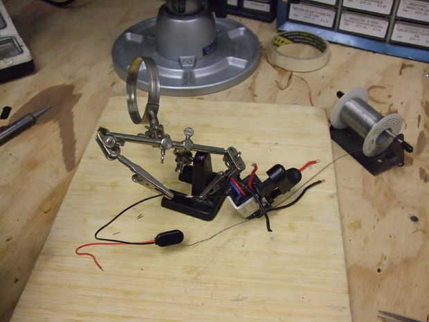 La soldadura de los componentes relevantes.  La pequeña placa de circuito fue en la base de carga.  No lo usé al principio, pero ayuda a la dirección invierte el procedimiento, así que volver a lo añadido.