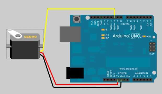 El circuito es muy simple. Conecte el cable de servo rojo a 5 voltios en el Arduino. Conecte el cable negro a masa de Arduino. Conecte el cable blanco a pin 10 del Arduino. Eso es todo!