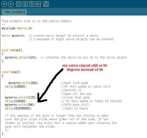 Nuestro código no es bajar y subir a la plataforma cada 12 horas. Para hacer esto, necesitamos decirle al servo qué dirección girar y por cuánto tiempo. Esto variará dependiendo de su memoria serva y pegamento.