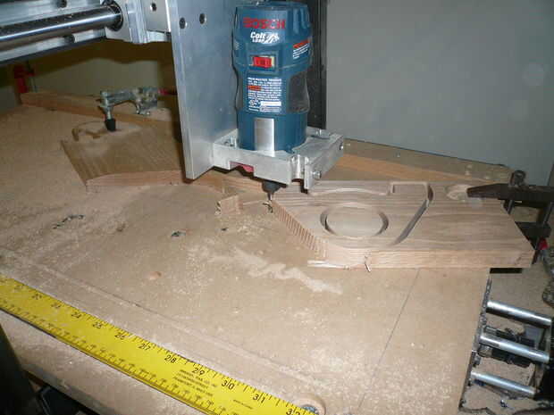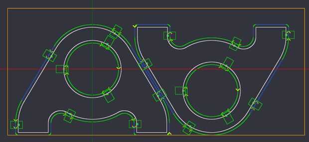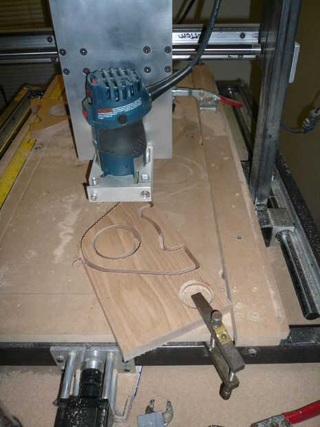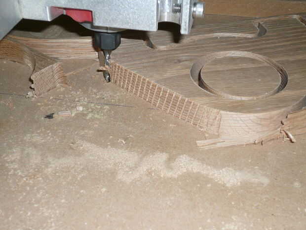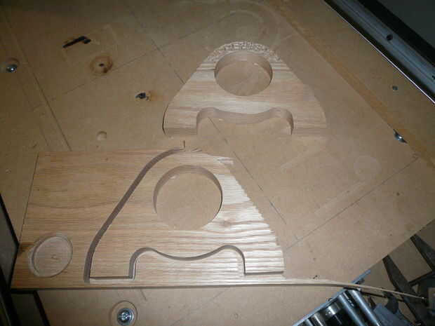 Si usted decide utilizar un material más grueso y cortar con un router, como lo hice, quiero darle un Consejo. Que corte las dos piezas juntas que ahorra tiempo y tiene sentido. Yo les espaciadas para dar suficiente espacio para el 1/4" bits estaba usando para hacer el corte. Esto no fue una buena decisión, debo haber espacio aún más. La primera parte fue sólo lo prevista y el router era cortar la segunda parte igual de bien. En el paso final de que toda la Directiva rompió suelta, enviando el primer vuelo de la parte y la segunda parte tiene atorado en la broca de fresadora. Esta había estancado el router y los motores paso a paso. Llegué a la parada una vez que comprendí lo que había pasado pero se estancó durante al menos un segundo o dos. La parte fue totalmente destruida por lo que terminé con mi dremel.