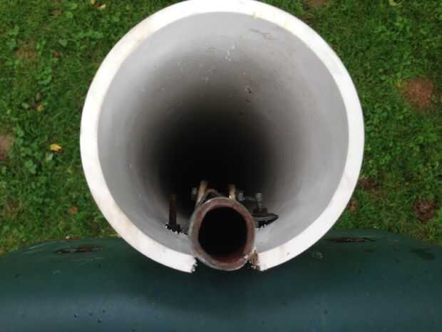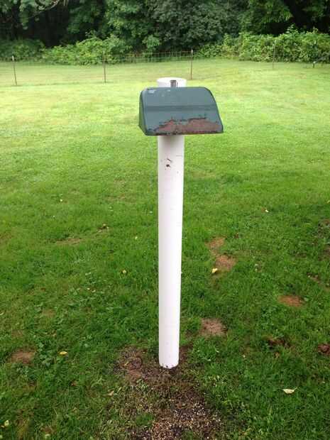 yo a colocar la tapa del comedero al polo. Este comedero especial se monta en la tapa. El deflector de PVC es en su lugar y solo necesita taparlo para que las abejas u otras plagas no pueden conseguir en el poste para construir nidos. Esto también evitará lluvia o nieve quede atrapada en cada tubo, que seguramente estallaría si congeló.