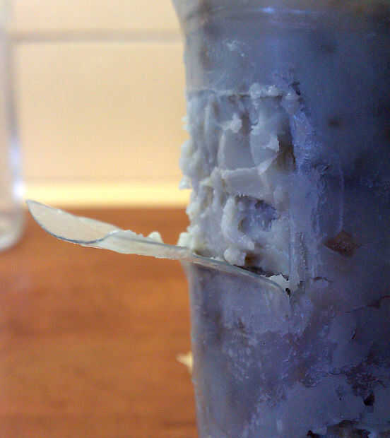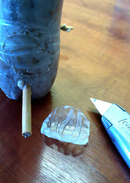 Cuando se coagula la grasa utilizar el pinchazo a Perfore dos orificios y poner el canal de palo de bambú y canal. Utilice el cuchillo de utilidad para recortar algunos agujeros en el plástico, para que las aves pueden acceder a la comida. Coloque la cuerda en el cuello de botella.