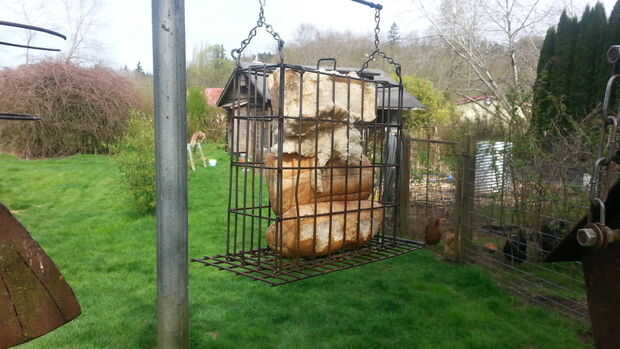 Tengo Pollos y ha estado guardando durante 40 años. Bastante atrás de tiempo descubrí la tienda de outlet de panadería local vende pan para su uso como alimento animal. Actualmente corre alrededor de $20 para el suficiente pan llenar que botes de basura de acero de 3-4 31. Las latas deben ser de metal para evitar los roedores. Tengo sobre una docena de pollos, darles de comer un pan o dos todos los días además de dejarlos pastar y tienen un suministro constante de alimentación de la capa de pollo comercial. El pan es una delicia para estas aves y una manera económica para alimentarlos. Estos pan en estas latas comenzar a recibir moho antes los pollos coman todos de él. Me di cuenta de que el residente y algunas aves migratorias le gustados comer esto así y un día armar un alimentador para pan de la tierra. Algunas aves prefieren comiendo de un comedero elevado, algunos son alimentadores de la tierra, esta cosa satisface todos. También reduce al mínimo los alimentos que los tlacuaches y mapaches son atraídos. Ellos y los pollos no se mezclan bien y arrojado para las aves silvestres que no comen comida era una delicia para estos comedores de pollo.