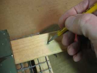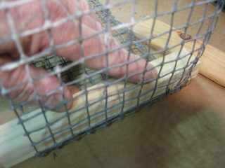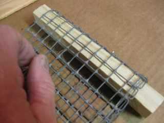 Mide 6" de un extremo de la pieza de tela metálica y haga una marca. Utilice uno de los montantes como soporte y línea de la marca en la tela metálica con el borde del bloque. Doblar la tela metálica sobre el bloque a un ángulo recto. Voltee la tela bloque y hardware y hacer otro ángulo derecho de la curva por lo que tiene forma de U.